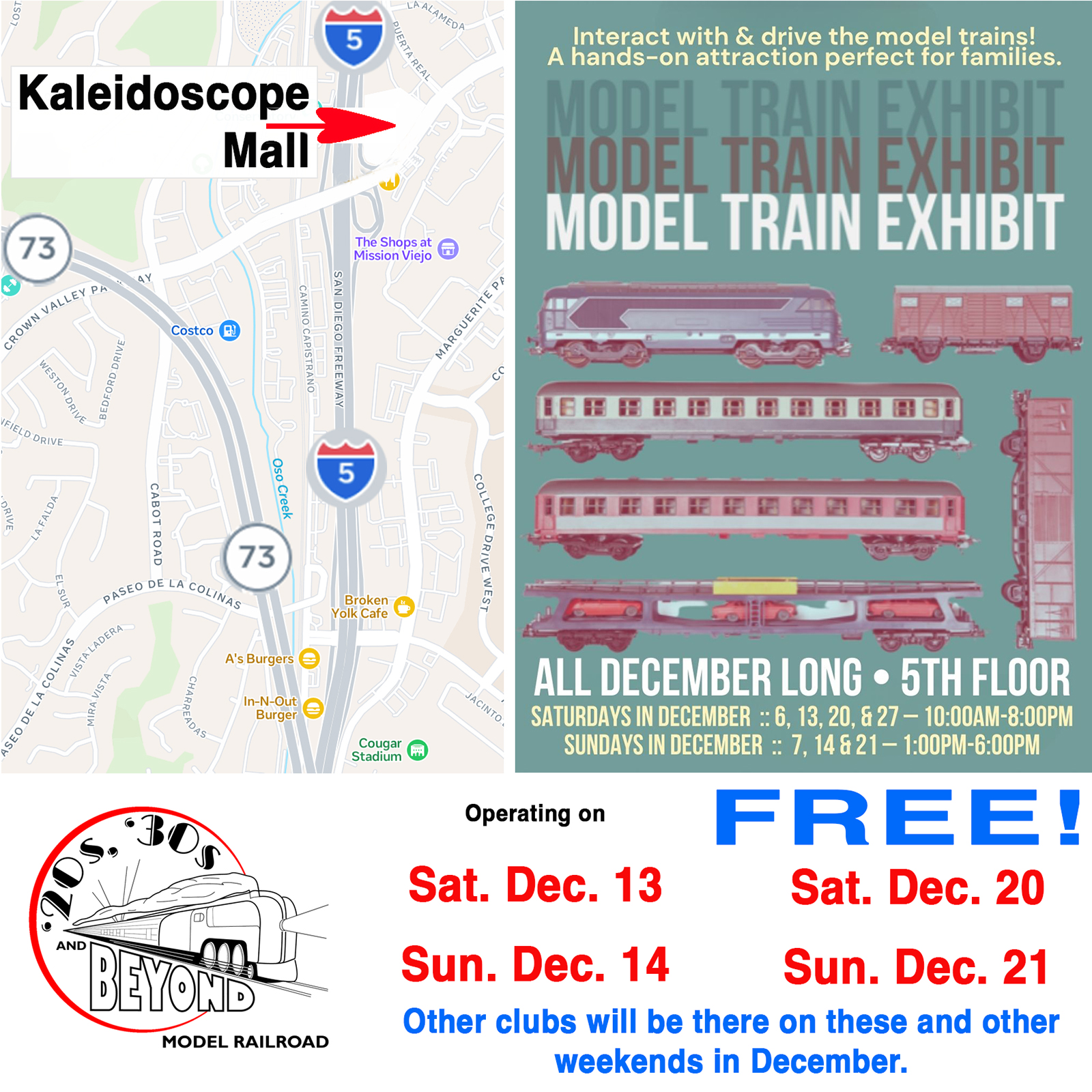 The '20s, '30s and Beyond Model Railroad replicates the golden age of railroading in 1:87 HO scale. Members build and transport their own six-foot-long modules that depict North American railroading during the period from the end of WWI through the steam-to-diesel era. We set up several times a year at public locations in southern California.