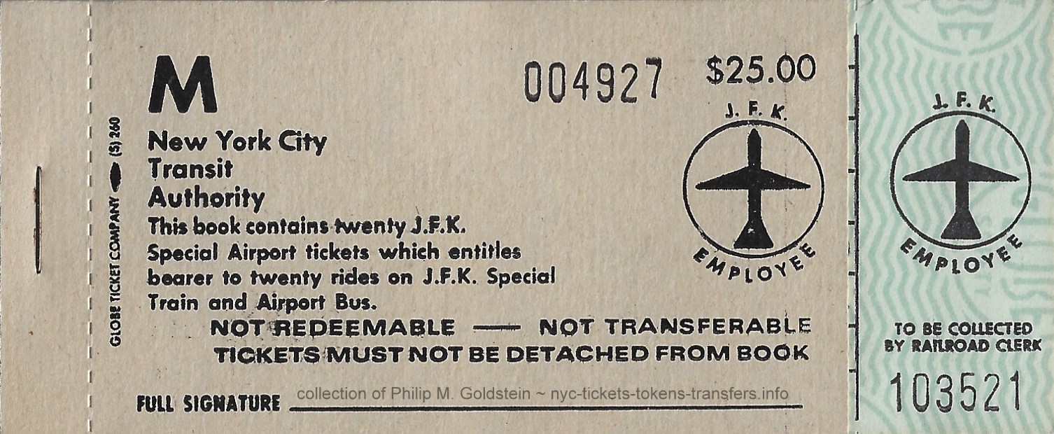 | January 1, 1979 | .50 | n/c | n/c | n/c | n/c | $25.00 ($1.25) | On January 1, 1979; employees of the various airlines as well as employees of the Port Authority of New York and New Jersey who worked at JFK airport; were provided with a discounted book of twenty tickets, sold for $25 ($1.25 per ticket). |