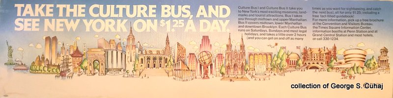 Culture Bus tickets were also sold at subway token booths located at: Grand Central Terminal, Penn Station, Port Authority Bus Terminal, Times Square, Rockefeller Center and Columbus Circle stations during the hours of operation of the Culture Bus.