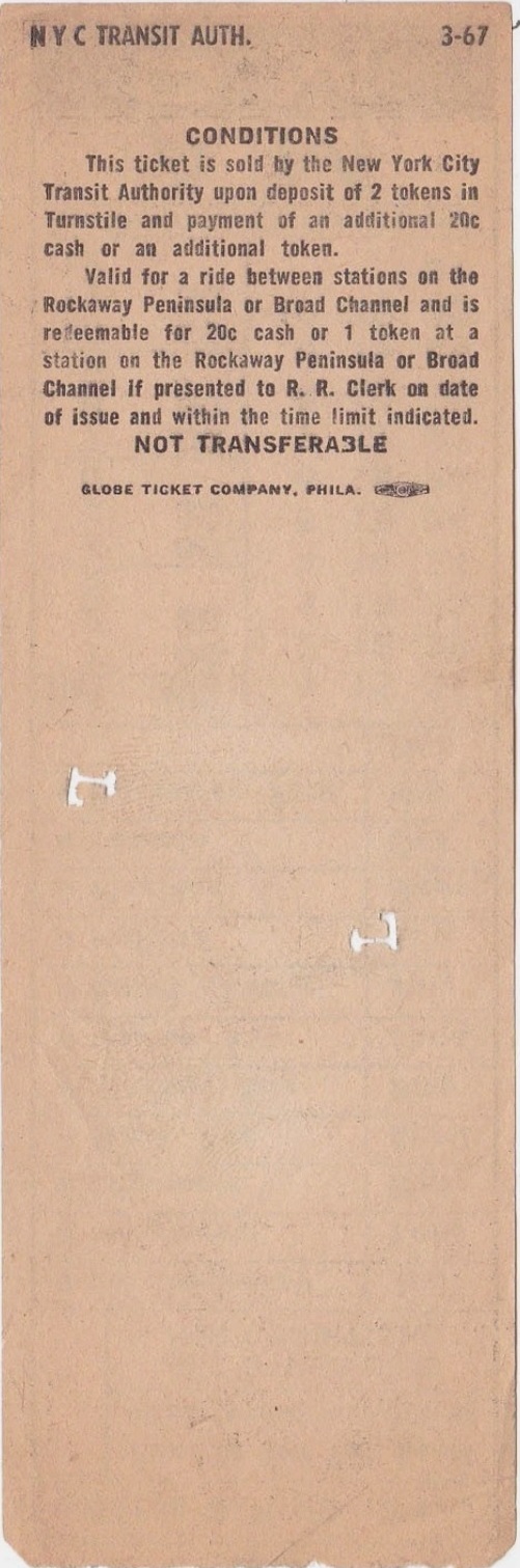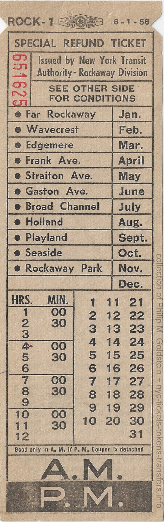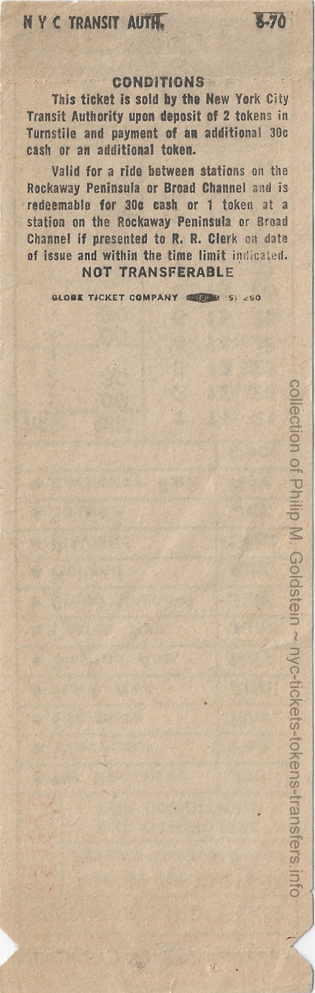 Note the front carries the 6-1-56 date, while the back has 8-72 and reflects 35 cent standard fare prevalent for this period January 4, 1972 through September 2, 1975 and when the Rockaway double fare was abolished. Ergo, this is the last issue for the Rockaway Special Refund Ticket. Oddly, the back is printed upside down to the front. It is shown here with corrected orientation. 2" x 6⁹⁄₁₆" no selvage |