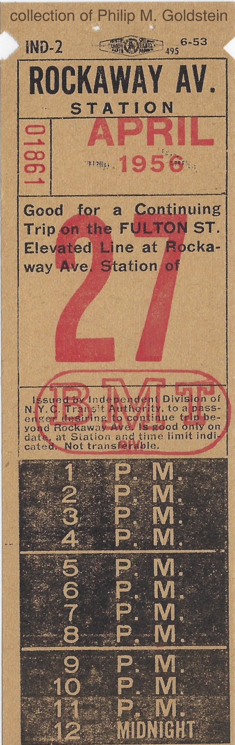 Shuttle) as well as Fulton Street Line at Rockaway Avenue. This is the earliest known first unification inter-divisional continuation ticket.