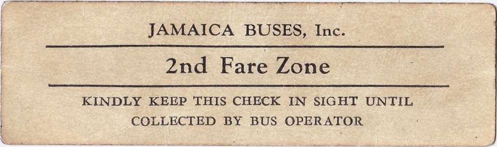 Operators Identification Check, August 8, 1941 between Pelham Bay and Eastchester Road or eastbound between between White Plains Road & Eastchester Road S. W. Huff, president It is believed that this ticket was for the Williamsbridge Road route where it intersects the Pelham Parkway route, as at this point the Pelham Parkway route was split into omni directional running along Pelham Parkway North (westbound) and Pelham Parkway South (eastbound) between White Plains Road and Eastchester Road. This would have prevented a passenger from getting a free round trip. |