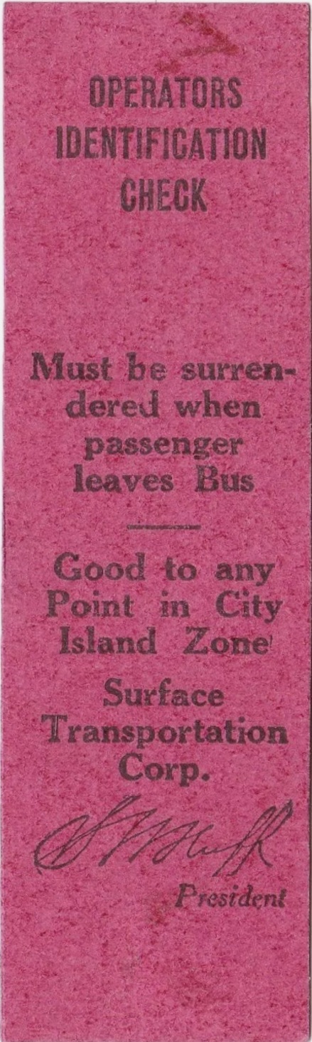 | North - PM (pink) hourly punch, detachable PM coupon Surface Transportation Corp of NY (receivership, Lester T. Doyle trustee) (Smith Patent copy) |