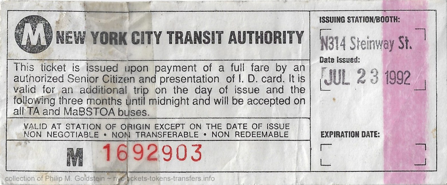 The New York City Transit Authority Reduced Fare for the Elderly program was inaugurated on July 1, 1969 (US Senate, "Older Americans and Transportation: A Crisis in Mobility; Document 91-1520; 12/29/1970) and was made possible by Federal subsidies. Applicants had to be over 65 years of age and not employed full time.