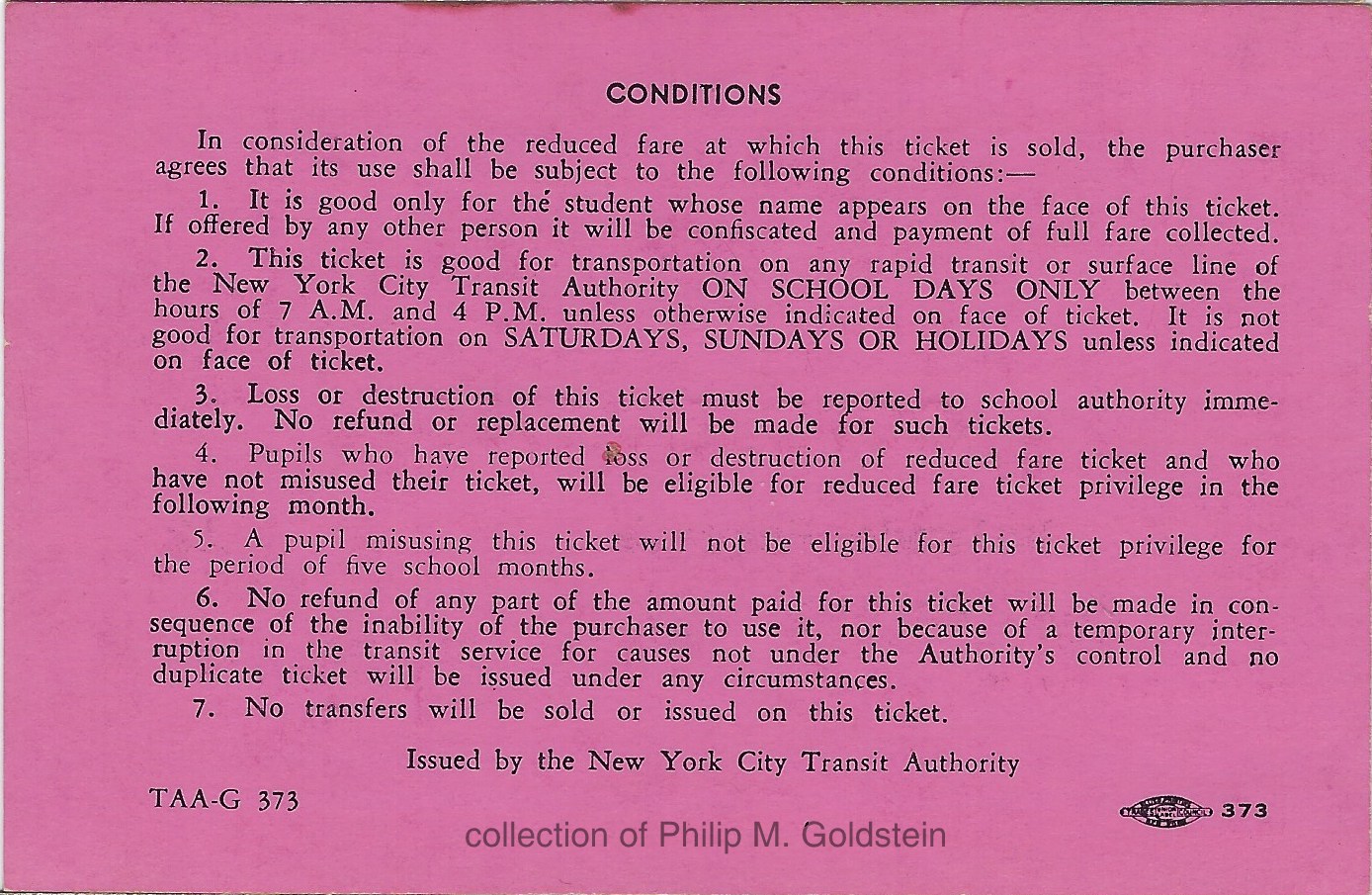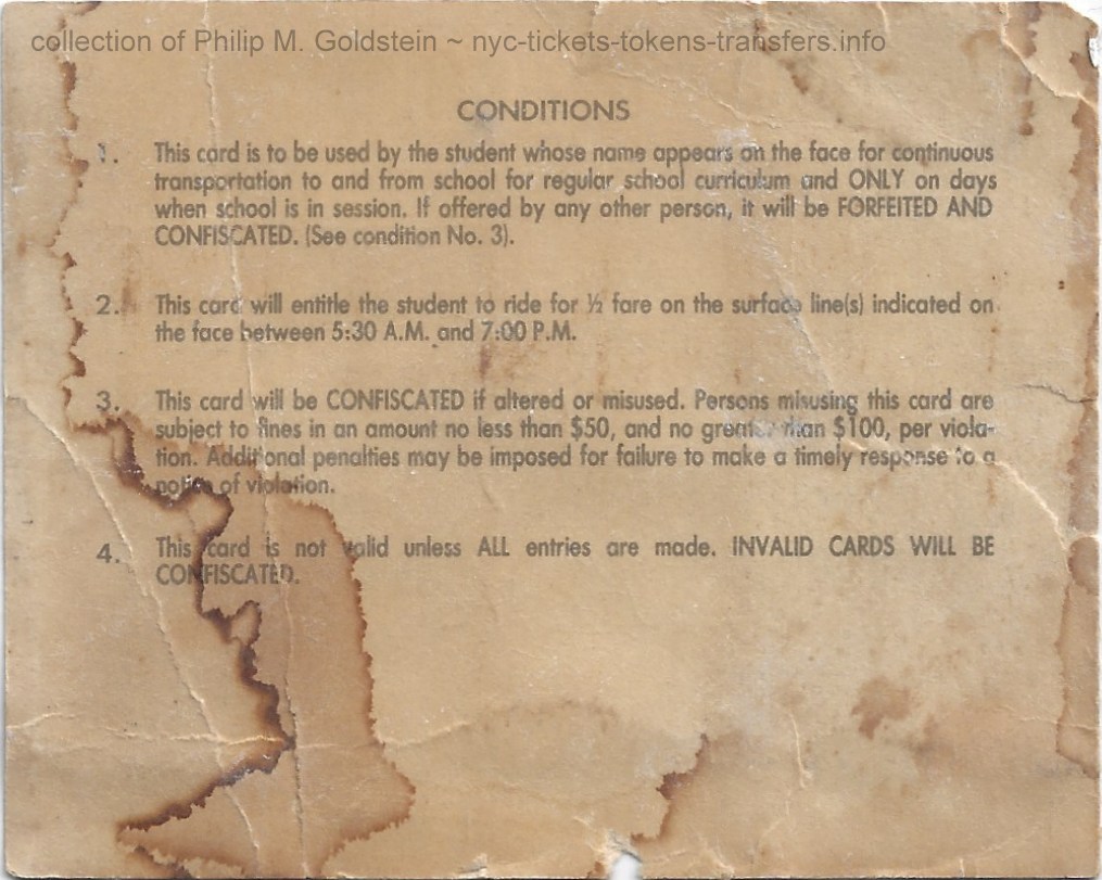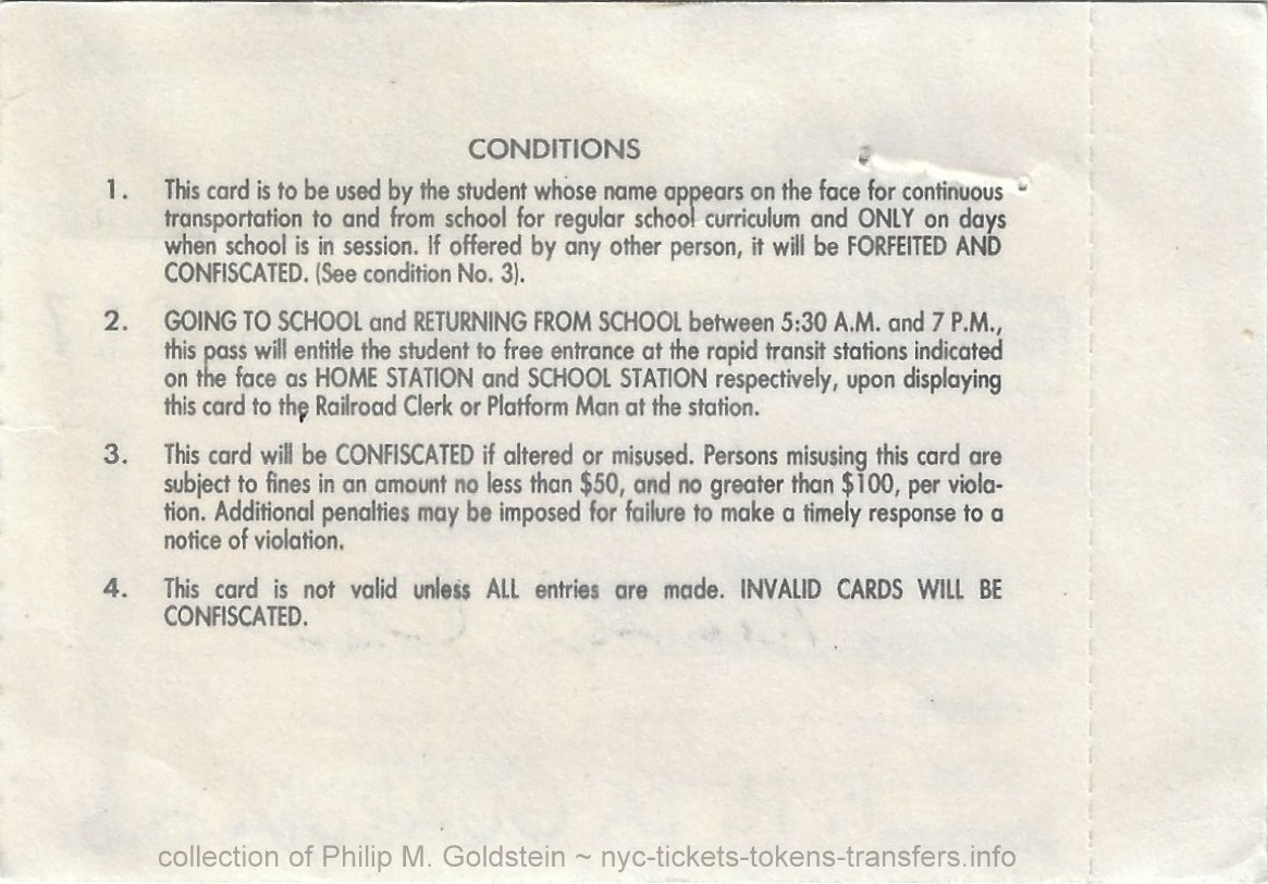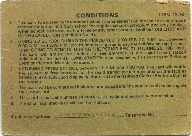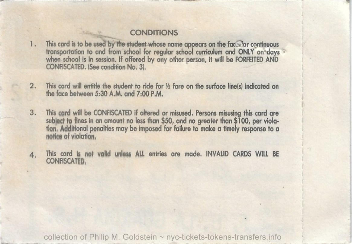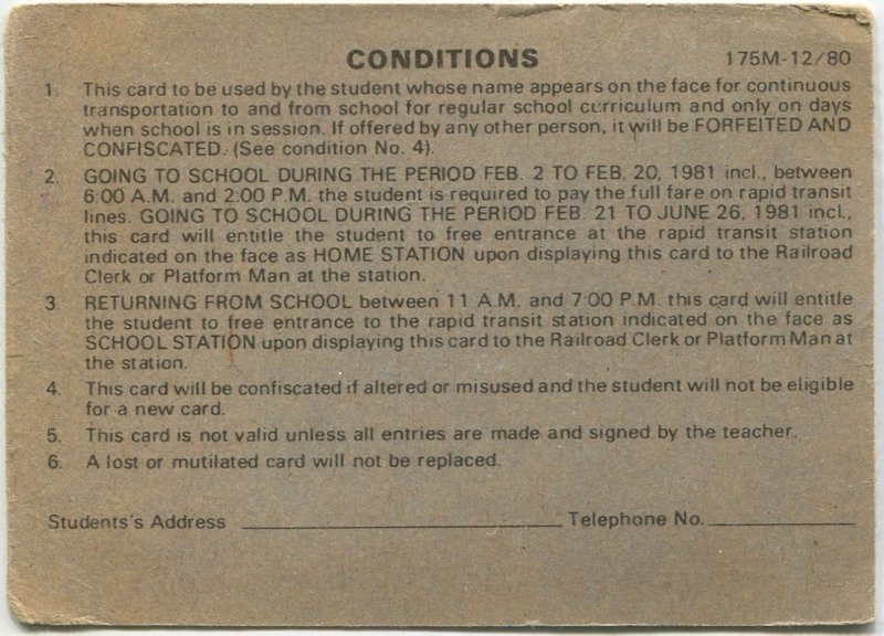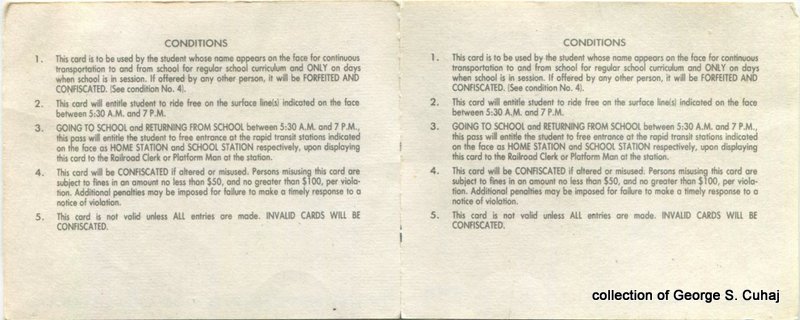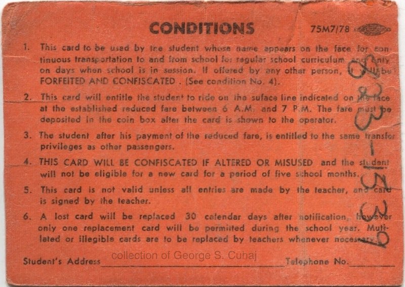 I was one of the lucky ones, if you would consider my childhood "lucky". I was eligible for a free pass, and it was good on both rapid transit and surface lines. Some kids were not as "lucky" - as theirs were only good for either the bus or the subway and then only still at a reduced fare. Even if you have a combination pass, you still had to pay.