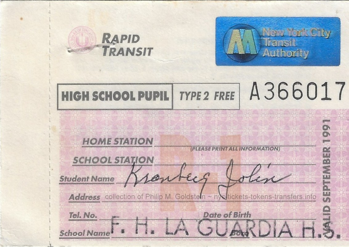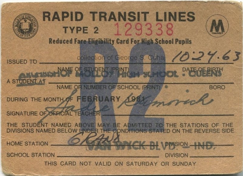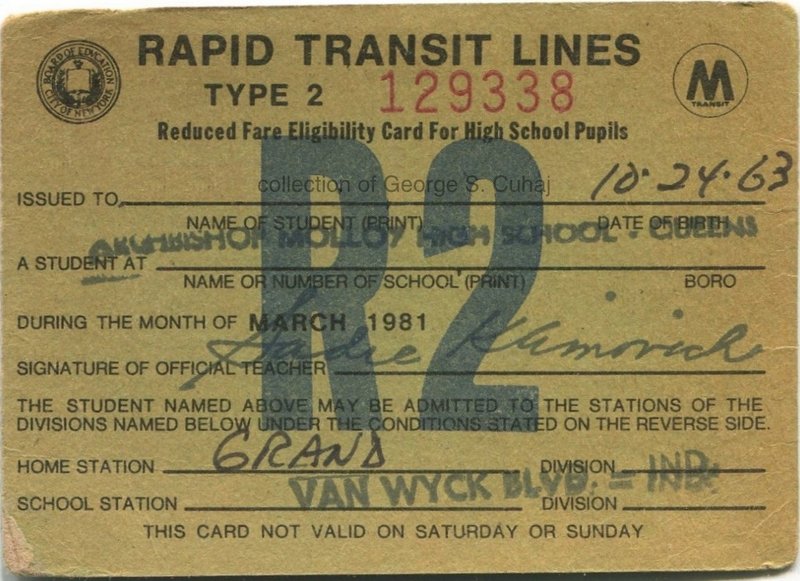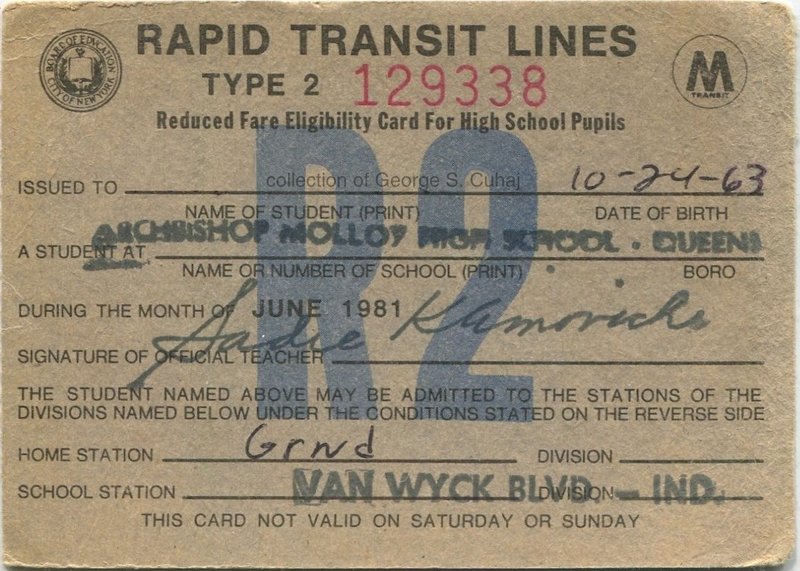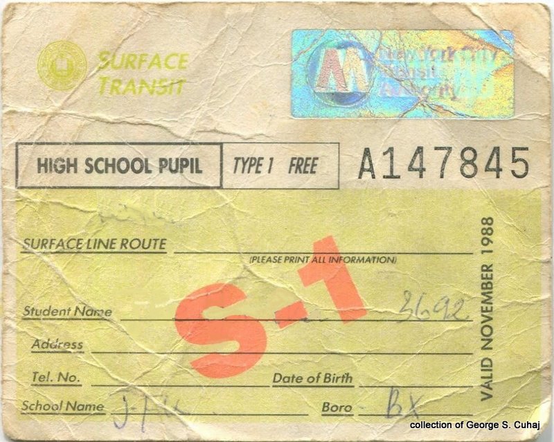 But I paid my penance for my lack of adherence to the NYCTA rules. I had kept every single one of my school passes - from September 1981 going to Reynolds until June 1987 when I graduated Murrow. 6 years of monthly passes multiplied by 10 months a year = 60 passes. But unfortunately, as my lack of character assessment in those days will now show, a former (note - FORMER) friend, filched my collection of school passes. Without a doubt; of all the things lost, stolen, given away, or sold over my life; loss of those school passes rank in the top three of items I regret not having the most. Some people miss friends and acquaintances - I miss the physical items.