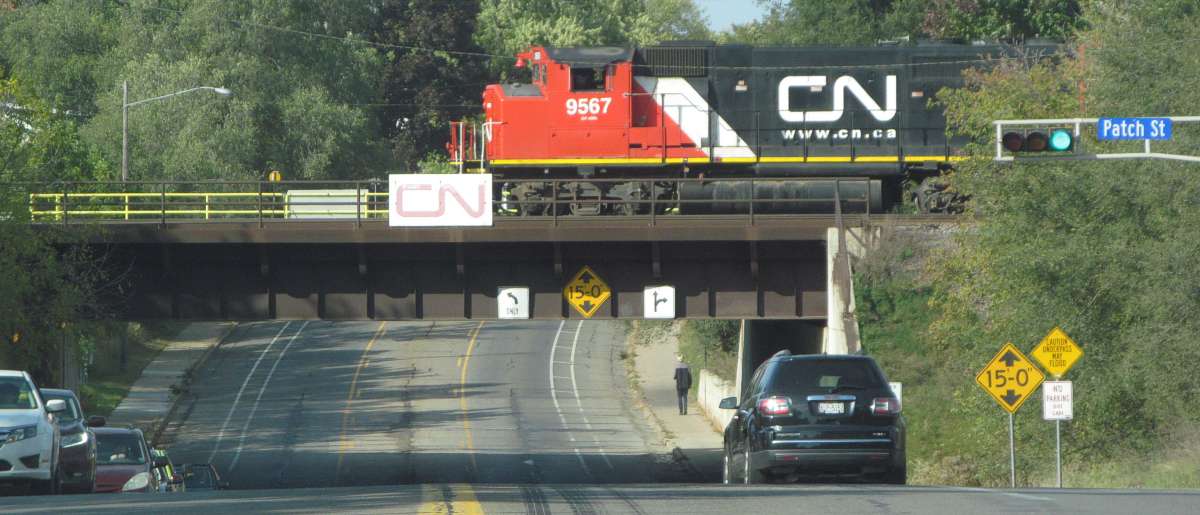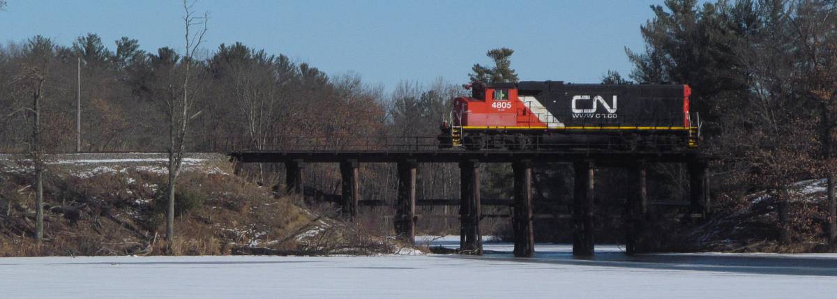Another day, and here's the Plover job returning from the Stevens Point paper mill and passing over the Plover River, running long nose first. |