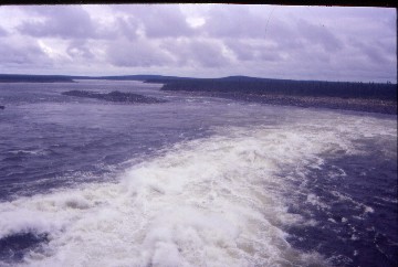 The rain had stopped for now as the train returned to Labrador and I photographed the water being released from the Menihek Dam then relaxed and listened to music down to Ross Bay Junction. At Eskers, a group of five adult falcons were holding a meeting in a large nest atop a trackside pole and Lake Menihek appeared to be about 110 miles long, stretching from the dam at Menihek to almost Ross Bay Junction.