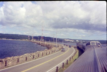 We rounded a bend and Canso Causeway was seen before we travelled over the deepest causeway in the world, 217 feet at its deepest point, which opened on August 13, 1955 and created a road connection between Cape Breton Island and mainland Nova Scotia. We entered Cape Breton Island and paralleled the Straits of Canso to our brief layover of Port Hawkesbury. We were told that our departure would be after the passage of a freight train so I visited a shop and bought a Lighthouses of Nova Scotia sweatshirt at forty percent off then an ice cream cone and walked to the end of the pier. Once I arrived there, the freight train started to move and departed, after which the Bras D'Or reversed into the depot and I was the first passenger to reboard, storing my purchases and returning to the Park Car's dome for departure.