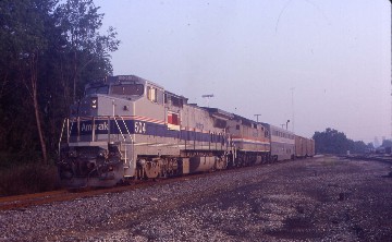 The Cardinal 51 9/4/2000Leaving town about four hours late, I did see the RCA dome and State Capitol from the end of the platform then went to the dining car for French toast and had a delightful conversation with a couple returning home to Chicago and a woman going to Chicago to fly on Virgin Air to London. The meal hit the spot and I enjoyed a follow-up tea back at my seat as I watched the Indiana scenery. As the Cardinal approached Lafayette, it gave me an opportunity to see the railroad's relocation around town; I do miss the street-running with the stop at the station there. We stopped at the new station before making our way out of town on the former Monon Railroad and at the town with the same name, we curved off to the west to Rensselaer. Due to the padding in the schedule, we continued to make up time, now only two hours and twenty minutes late.