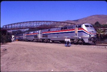 9/7/2000 My morning started with some ginger ale for a stomach ache and a little more sleep then I arose for breakfast prior to Davis, California, a French toast and bacon event. I rode the Parlour Car along the Carquinez Straits and the rest of the way into Oakland, where five Road Railers on the rear of the train were cut off then enjoyed the morning sun at our extended station stop at the Jack London Square station in Oakland. I napped to the Pajaro Gap before showering and starting lunch along the Elkhorn Slough and finishing at Soledad, with all sorts of train riding questions being asked by my tablemates. I enjoyed the journey up the Salinas Valley, working on a couple of more drinking song lyrics for a future album, thus giving me thirteen done on this trip. The Starlight made another fantastic descent down Cuesta Grade and around the horseshoe curve before we arrived at San Luis Obispo early, where the late northbound Starlight arrived and the final major problem of this trip took place.