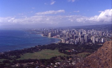 Walking off the plane, I felt as though I already had accomplished something since probably not too many people visit all fifty states. I followed the signs to the rental car counters and Avis had me checked in within two minutes and I received a very good deal because I had travelled on American Airlines. A shuttle bus took me to the lot where a Chevrolet Prism had its keys in the ignition and it was my easiest rental car yet. As I drove away from the airport, I wondered in how many states I driven and worked out seven versus forty-nine in which I had ridden a train. Driving east on Interstate H1, I made my way to Waikiki to check into the Radisson Prince Kuhio and received a 28th floor room with an ocean view and upon walking out onto my balcony, realized I was a block from the beach and had a partial view of Diamond Head, my first destination.