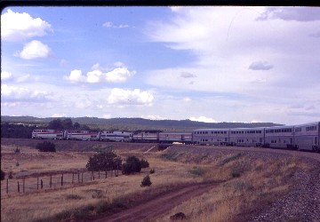 6/19/2000 I awoke just short of the new stop at Williams Junction where there was a shuttle van connection to the Grand Canyon Railway station. I spent the rest of the morning reading, with my only interruption being the many freight trains we met on the fly. We arrived at Albuquerque about ten minutes late and I was off for an ice cream then browsed the Indian jewellery before reboarding with the "all-aboard" announcement. We sat for an inumerable amount of time before an announcement was made regarding a problem with the locomotives and all passengers were allowed off until it was solved. It was sun tanning time with the occasional joke like "At this rate we will still be here when they open the new station!" At this point, the building was still in the steel frame stage. After the crew shuffled the engines, we finally departed two hours and five minutes late.