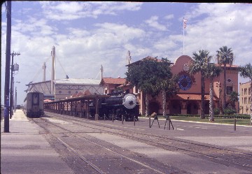 I called the Amtrak agent at Solana Beach and talked to Eunice, asking her to check the status of the Sunset Limited, learning it departed New Orleans at 1:00 AM. It would have been nice had someone here told the truth to the passengers. I spotted a route over to the Alamo Dome and once reunited with David, we walked over to it and with a little good luck, found an open door and entered this huge building as there was a Christian Youth Meeting with 15,000 people occurring and one of the leader's closing prayers had special meaning to me. It was as though God wanted me there to hear that message. We walked around the outside of the Dome, spotting Bill Millers BBQ, which just happened to be what they were serving for lunch. By chance, I met two former San Diegan Lead Service Attendants, Edwin Byrd and Shirley Robinson, who both just happened to be working the Sunset Limited back to Los Angeles. We then found a store where I had an ice cream before helping to distribute sack lunches to the passengers on the train.