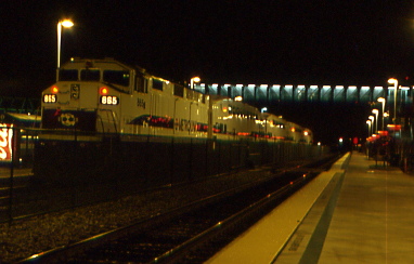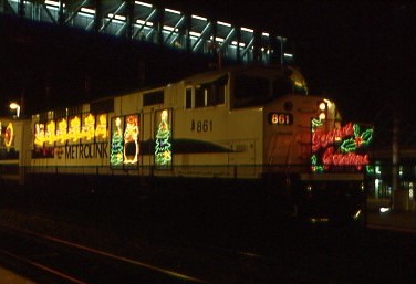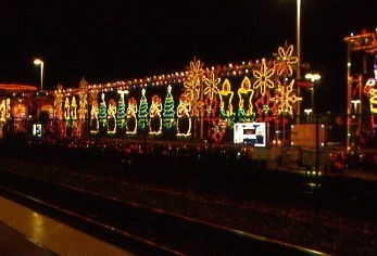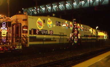 Every Holiday Season Metrolink, our excellent Southern California commuter train operator, runs the "Metrolink Holiday Toy Train Express - Christmas Train" to almost all the stations on the lines they serve. A different program is presented every year and toys are collected for the Spark of Life Toy Drive. The train is scheduled and runs in the evenings unless it is raining, then those dates are rescheduled. So now enjoy the view of over 30,000 lights on the 2001 version of the Metrolink Holiday Toy Train Express at Irvine.