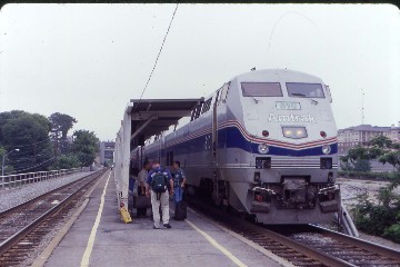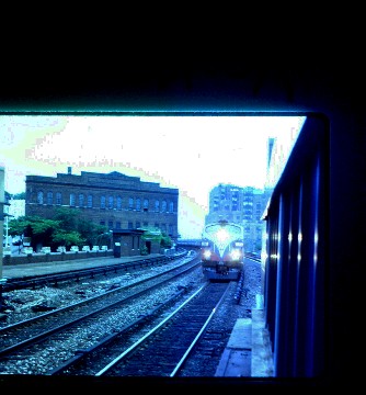 Acela Regional 170 6/13/2001The next morning I was back at Penn Station waiting for Acela Regional 170 to take me to Boston but it took four electric locomotives. As the train arrived and after I boarded, the crew removed the engine that had brought the train from Washington, DC and replaced it. We left New York City an hour late and made it to the approach to the Hell Gate Bridge, where it was discovered that our new locomotive did not have cab signals needed to operate on this section of the Northeast Corridor. We sat and waited for a rescue engine as a southbound Acela Express passed us. We finally were underway and made it to New Haven, where engines 2 and 3 were cut off and the fourth and final engine added. Train 170 had no further delays and I detrained at Back Bay Station and walked to my new hotel in Boston, the Chandler Inn.