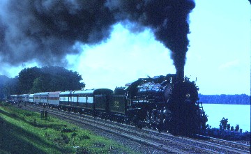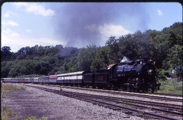 That gave me time for an ice cream cone before the third runby occurred and everyone reboarded. The climb up Rolla Hill was spectacular and the sound of the engine even more incredible as it echoed through the cuts and off the surrounding hills. The vestibules were overflowing with passengers, so much so that an Amtrak official could not make his way through the train and ordered all the top dutch doors to be shut for the reminder of the excursion. We were running so far ahead of schedule that another double photo runby was held in Lindenwood Yard on the shady side, as had been done during the Norfolk Southern steam trips. We still arrived in St. Louis early and with the bus ride back to the hotel, the 2001 NRHS convention ended. I went to bed right away as I had a 4:25 AM train to catch to Chicago.