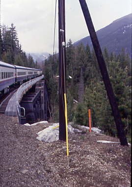 Rogers, where the new line through the Mount MacDonald Tunnel Line meets the original Canadian Pacific line. Far below is the westbound line that the railway built which uses the Mount Macdonald Tunnel, the longest rail tunnel in North America.