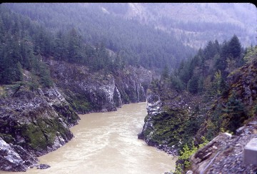 The view towards Hells Gate. This is a narrow rocky gorge of the Fraser River Canyon south of Boston Bar. Explorer Simon Fraser recorded a difficult portage in 1808 around the churning waters of this section of the Fraser River. First known as the "great canyon," its name is associated with the disastrous impact of Canadian Northern Railway construction on the river's salmon resources. In 1913, what became the Canadian National Railway hewed its way through the Rockies and the treacherous Fraser Canyon. While blasting for the passage of the railway, a rock slide was triggered which partially blocked the Fraser River at Hells Gate. A dramatic drop in the salmon run resulted.