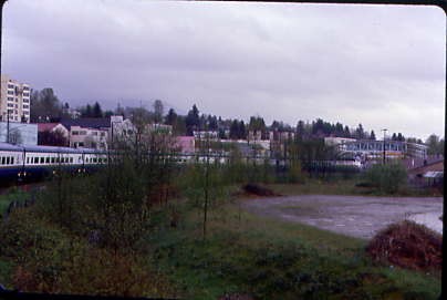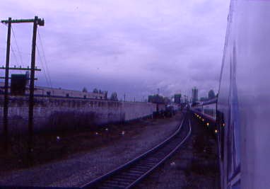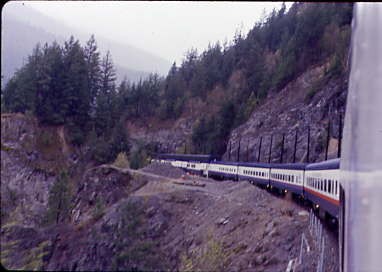 My day started pre-dawn as I checked out of the Day's Inn and rode Skytrain to Pacific Central Station, where I checked in with the Rocky Mountaineer Staff and received my car/seat assignment. I went for MacDonald's in the station for breakfast before doing a few word fill-in puzzles until boarding time. With a toot of a train whistle, I led the way to the train and was the first passenger of the 2001 season to board, climbing onto car seven of a twenty-two car consist. Although it started to rain, nothing was going to damper my enthusiasm at the start of this rail journey. My car attendant, Tina, handed out letters to all passengers which, when held up in order, read "Cheers! To a great 12th Season". I held up the "S" and the exclamation point. As we departed Vancouver, we gave all the employees a big send-off with the letters and waving. The entire office staff of Rocky Mountaineer were on the ground to see us off and I wondered if we won the contest that the onboard crews were having? I hoped so.