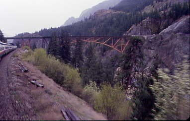 Our train then went under Canadian National's bridge, a truss arch bridge, 810 feet long and 220 feet high with its northwest abutting into a near-vertical rock face. The southeast end of the bridge crosses the CPR tracks about 330 feet north of the CPR bridge. In other words, the railroads switched sides of the canyon. This was necessary because the Canadian Pacific built through the canyon first and took the easier route, with the Canadian Northern building through here on the other side of the canyon. Canadian National did have the advantage of more modern construction methods. Cisco was a truly spectacular place.