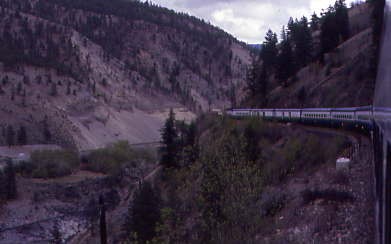 Towards the front of our train.The first area of this canyon that we entered is known either as Painted Canyon or Rainbow Canyon for the vivid colours in the rocks. The Canadian Pacific line was built on the south side on a ledge above the river and has the easier route, while the Canadian National line plunges through eight tunnels and rock sheds to achieve their route through the canyon. It was truly spectacular and I was happy knowing that I would be riding on the Canadian National route through here in daylight in three days.