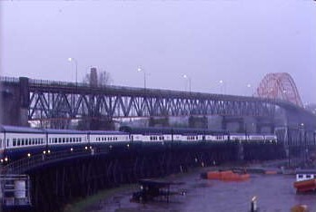 Curving onto the main line. All eastbound trains travel on Canadian Pacific tracks east to Basque, while westbound trains travel on Canadian National; this is termed directional running and started in 1995. For me, this was now where the fun was going to start, a daylight ride up the Fraser River Canyon in the rain. I did not care what the weather was like, I was going to enjoy this no matter what. We passed Nicomen Island before crossing the drawbridge at Harrison Mills.