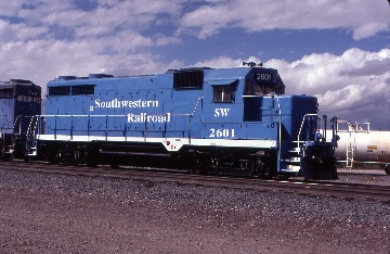 Once I was off the Sunset limited, I heard a rumbling coming from behind the depot and when I walked over, it was Southwestern Railroad GP26 2601, ex. National Railway Equipment 2601, exx. Illinois Central Gulf 2601, nee Gulf, Mobile and Ohio GP30 502 built by Electro-Motive Division in 1962.