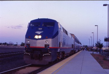 I enjoyed a steak sandwich and Amtrak's problems were discussed at the table. Later, we had a nice rain shower prior to the wonderful sight of our train rounding the curves at Chappell. The Chief crested Glorieta Pass and at Canyoncito, we passed our eastbound 29-car counterpart. We arrived at Lamy and for once, the Santa Fe Southern passenger train was in the station at the same time I was since it had arrived early and I hoped to be able to ride it some day. We arrived at Albuquerque almost an hour early so I picked up more postcards for my 50 State postcard wall in Room 29 at McFadden Intermediate and also picked up a USA Today. I escaped the heat to the coolness of my room and waited for our on-time departure from New Mexico's largest city.