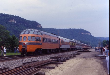 Our train departed fifty minutes late after that late-running train arrived and we ran at a good pace to Milwaukee, where we were greeted by the private cars "Silver Foot" and "St. James Place". Our westbound train was delayed here by a SOO Line coal train and number eight slowed later at Cooney for a Canadian Pacific Railway 101-car freight train. East of Portage, I enjoyed a thunderstorm from the dry environment of the train and felt sorry for anyone boarding or detraining in Portage during the downpour. The Builder next stopped at the beautiful Wisconsin Dells and after Tomah, we went through the lone tunnel on this trip at Tunnel City, then dropped down to La Crosse and after the station stop, we crossed the Mississippi River into Minnesota. The stops at Winona and Red Wing were made, where members of the Overland Chapter of the National Railway Historical Society detrained to reach their hotel early for tomorrow's Union Pacific 3985 excursion that I was also riding. In addition, a drunk was removed from the train who had tried to open a side door to get off while we were still moving; he was handed over to the Red Wing police. I napped for the rest of the way into Minneapolis, where I detrained to start my next rail adventure.