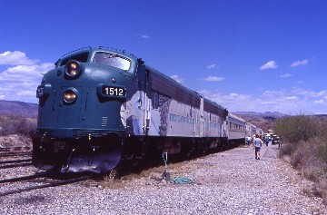 4/19/2002 I awoke at 4:00 AM and after my morning duties, was on the road by 4:40 AM and departed that early so I would miss the San Diego traffic, which worked out beautifully. I had Interstate 8 all to myself and after filling the car with petrol in Yuma, followed the Sunset Route of the former Southern Pacific, now Union Pacific, to Maricopa and found an eastbound freight at Kinter and after driving dirt roads, managed to get ahead of it on the freeway to Mohawk, where I was waiting for it. There were four other westbounds but the lighting was not right so I just watched them roll by. I had a very pleasant drive and when I arrived at Maricopa, found the new Amtrak depot made out of California Zephyr dome-observation car "Silver Horizon", one of the most very unique Amtrak depots in the country. I drove into Phoenix and had lunch at Alice Cooper's Cooperstown where I enjoyed a smoked prime rib which was excellent. After I looked around, I went to the Motel 6 on Northern Avenue and checked in.