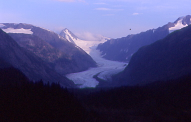 The overlook for Trail Glacier at MP 44.3. The rock and dirt in the middle of the glacier is a medial moraine. Trail Glacier got its name because a trail was built upon its face, since it was easier to walk the glacier than fight the brush, river and rugged terrain down in the valley.