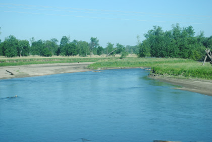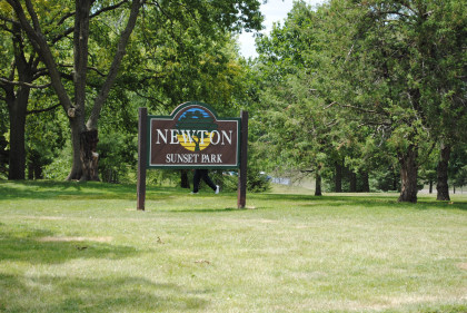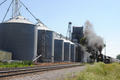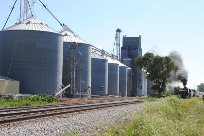 We ran by this lake before we arrived at Marengo and those who wanted to participate in the photo runby detrained. I suggested to Kathie that she join in so she could see her first photo runby. I would walk down the road to the point where I could get the grain silos behind our train.