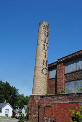 The remaining portion of the Spaulding Manufacturing Company smoke stack; the top few feet of it fell years ago so it just reads "Aulding". The "Cedar Rapids" set off a hot box detector so we had to stop to inspect it.