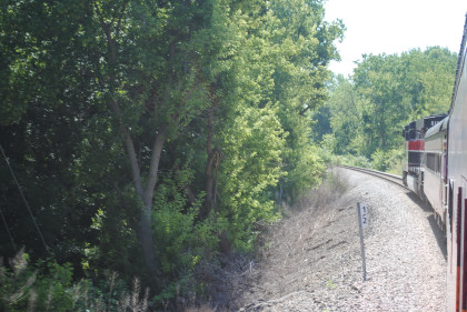 Iowa Interstate ES44AC 513 in Rock Island heritage paint scheme passed us on its way to the front of our train, which was really the rear. We left the shop area and pulled down to the east switch, but had to wait for a switch lock to be removed. We departed Yocum Connection at 9:46 AM for Rock Island running backwards on the way to Iowa City.