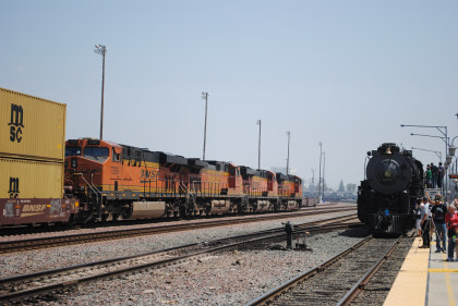 Next came BNSF 7209 East. After yelling "Get off the tracks!" to three photographers, I went and bought a hot dog and Coca-Cola then walked through the train again, stopping in "Tioga Pass" to talk with Norm. Finally a westbound train approached.