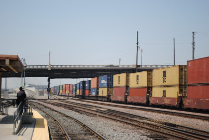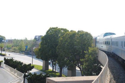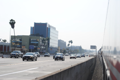 The train heads for the middle of the San Bernardino Freeway.