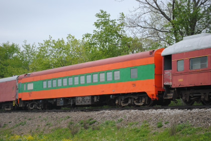 AC&Y Railroad Equipment company coach 721, ex. Illinois Central 52-seat coach 2678, exx. Illinois Central divided coach 3251, nee Illinois Central 3143 built by Pullman as a divided coach in 1919. This car is painted different on each side.