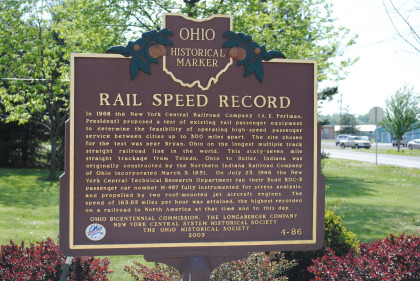 The speed record sign commemorating the event by New York Central jet-powered RDC 497 occurred along this stretch of New York Central Railroad tracks.