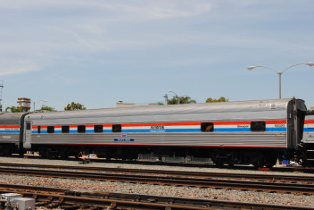 Amtrak sleeper 10020 "Pacific Bend", ex. Amtrak Police Department Special Communications Car 10020 "Pacific Command" 2007, exx. Amtrak crew-dormitory car 2504 1997, exxx. Amtrak 2903 1977 (upgraded from steam heat to hend end power), exxxx. Amtrak 2603 1971, nee Union Pacific 10 roomette-6 bedroom sleeper 1404 "Pacific Bend" built by Budd Company in 1950. The original name has since been re-applied and the car served as a sleeper for Amtrak staff during the 40th Anniversary Exhibit Train's tour.