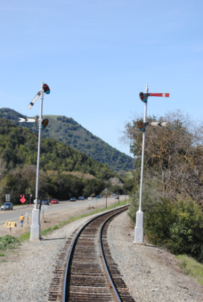 The train ran through a pair of semaphore signals.