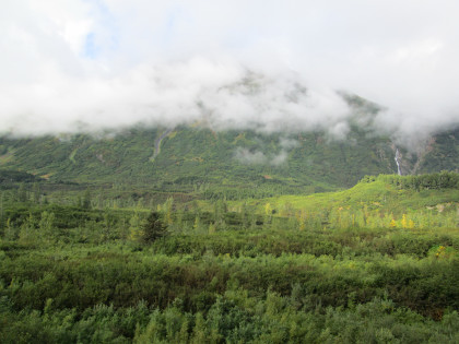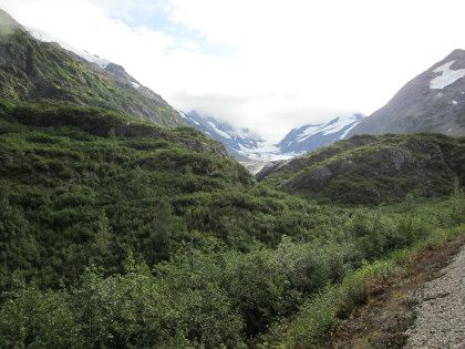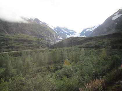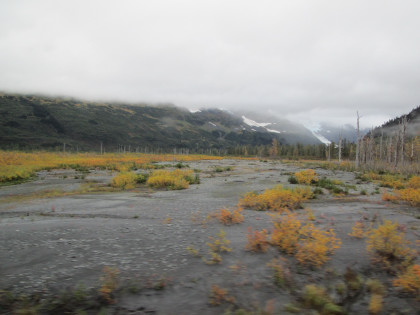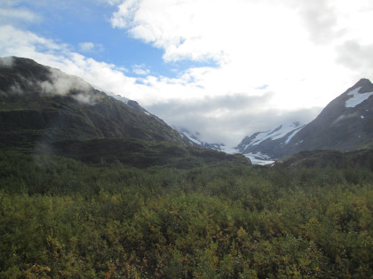Views of the Bartlett Glacier which was named in 1907 for Frank Bartlett, Alaska Central Railroad civil engineer. The glacier is visible just 800 feet from the track. Deadman's Glacier rises above.