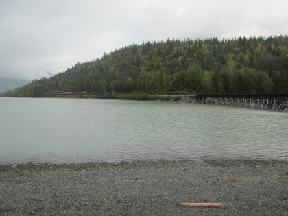 Later we rolled by Upper Trail Lake before we came to Middle Trail Lake {pictured} where we would stop for photo runby at Moose Pass. I detrained to be a part of the photo line and we walked down by the lake and I stood for the reverse move.