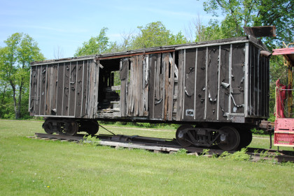 A wooden box car of unknown origin.