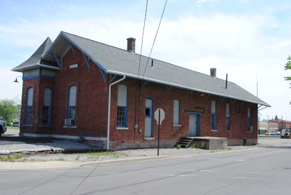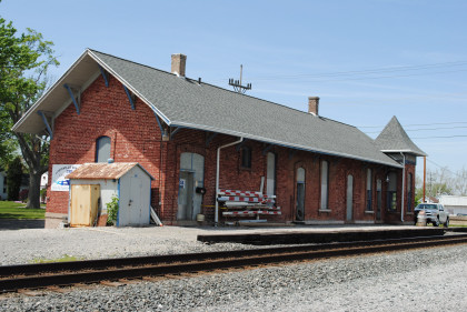 The brick Cincinnati, Hamilton & Detroit station in Ottawa was built in 1900 and replaced a wooden structure. At the time two railroads crossed where the square tower is at the northeast corner. The Cincinnati Hamilton and Dayton line ran north-south while the Findlay, Fort Wayne and Western line ran east-west. The FFW&W line has been removed. The CH&D later became B&O, which ended passenger service here in 1971. It is now owned by CSX which uses the depot for storage.