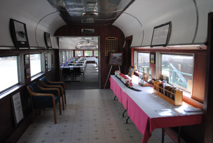 Chicago, Rock Island & Pacific observation car 454 "Minnesota", built by the Budd Company in 1937. It was rebuilt into an instruction car in 1965 and is painted as New York Central "City of Elkhart" to represent similar Budd-built observation cars that were an integral part of the post-war Great Steel Fleet of streamliners.