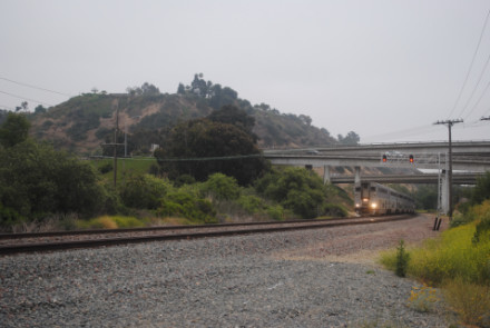 Coaster 638 heads to the Santa Fe station in San Diego and I went down and under the tracks, finding AC Adam who just arrived. We went out to Pacific Highway north to Sea World Drive, to Interstate 5 north to Mission Bay Drive, to Santa Fe Street which we took to where it ended and parked. From here we walked along the bicycle trail to just north of Elvira where I set up for my first train, which did not take long to arrive.