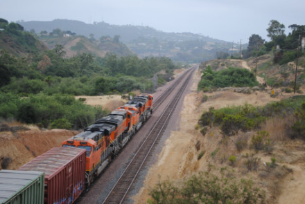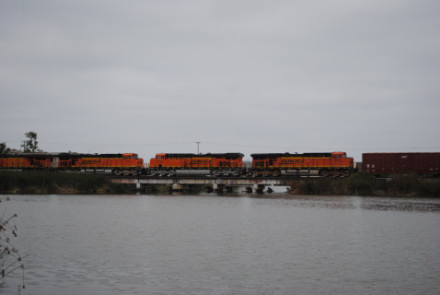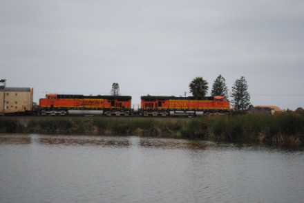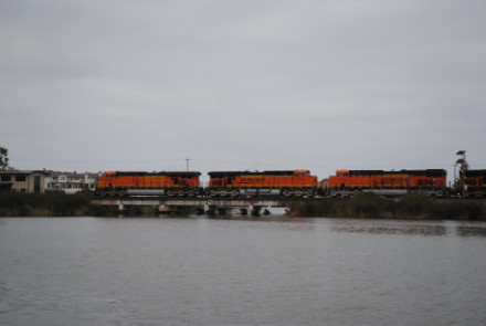 Bill Compton and his daughter Maryann picked me up at 5:50 AM sharp and we headed for San Diego County down Interstate 5. As we were travelling south, we came across a red signal telling us we were catching up to something. We neared Stuart Mesa and found a southbound BNSF freight heading for San Diego so exited Interstate 5 at Cassidy Street in Oceanside then turned left onto Carlsbad Boulevard and just after the Buena Vista Lagoon highway bridge, we parked and would be here until Pacific Surfliner 763 went through. We met two fishermen and then heard the horn of our BNSF freight so set up for our pictures.