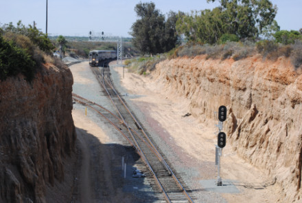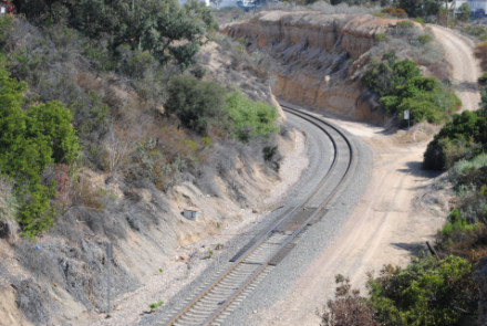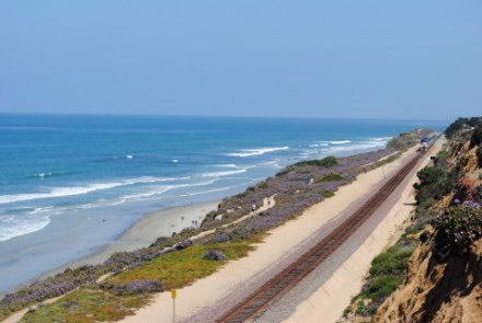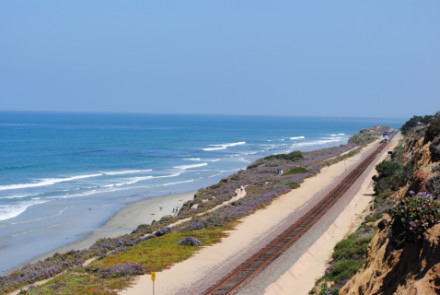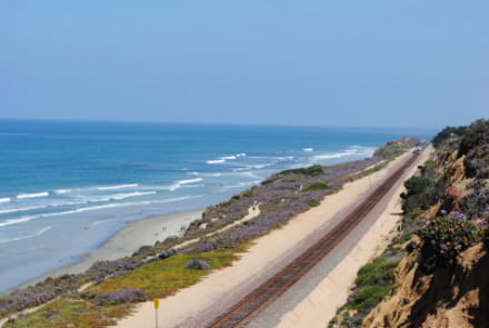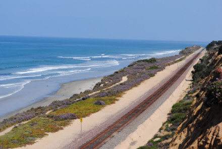Pacific Surfliner 769 for Goleta came under Miramar Drive. From here we went west on Miramar Drive to Interstate 905 North to Interstate 5 North to Carmel Valley Road, stopping at a local store for snacks. I called Let's Talk Trains before we went to Coast Highway north to 4th Street in Delmar and parked on Strafford Street. As I walked over to the cliff overlooking the tracks and the Pacific Ocean, I heard Coaster 681 for Oceanside. We walked south to our photo location.