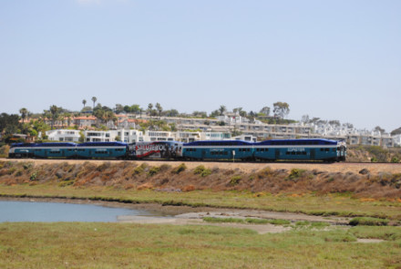 Coaster 684. Bill and Maryann found me and we headed north through Solana Beach to a Mexican restaurant parking lot at the San Elijo Lagoon to catch Pacific Surfliner 768.